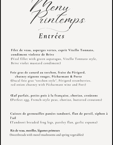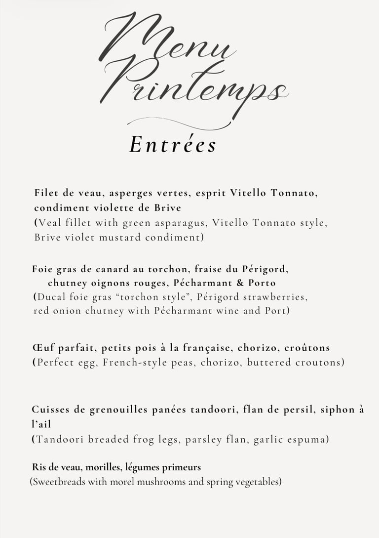 Nous pouvons également établir d'autres entrées selon vos préférences et celles de vos convives, les plats ci-dessus ne sont que des suggestions et une idée de plats que je prend plaisir à cuisiner.