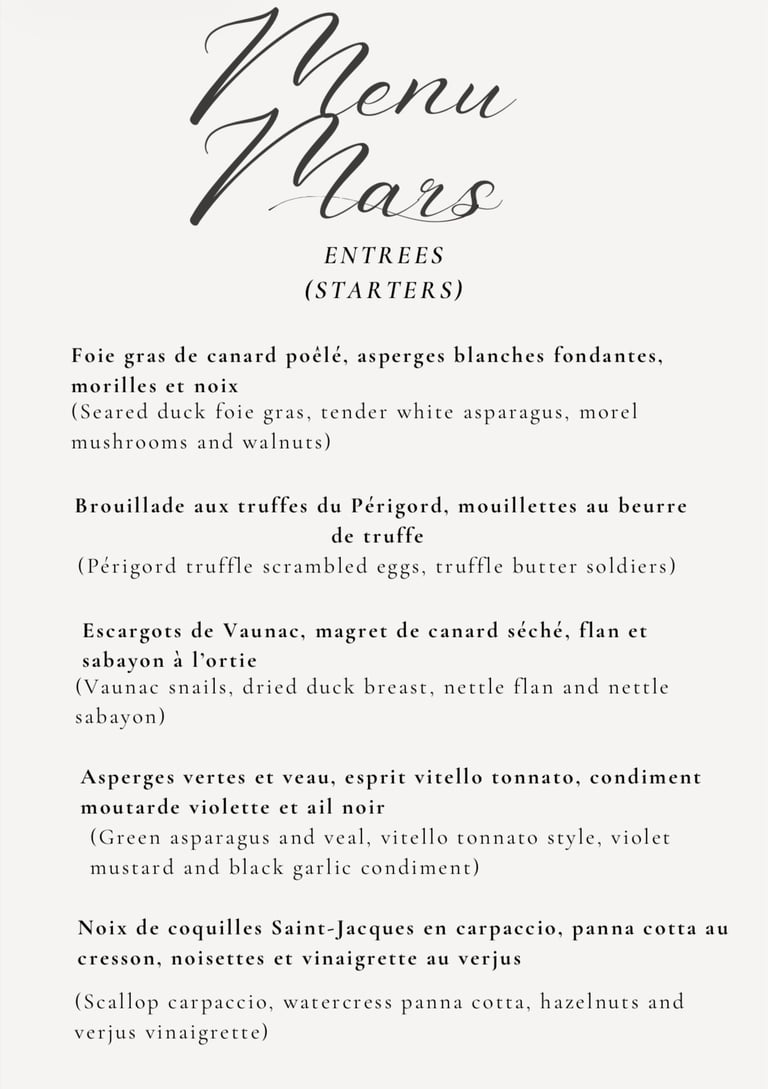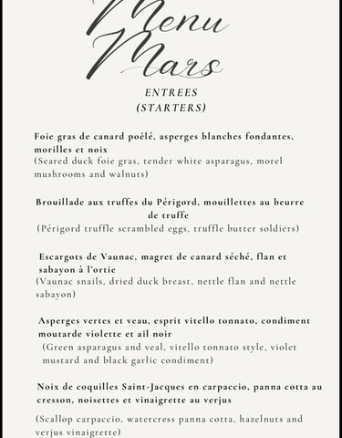 Nous pouvons également établir d'autres entrées selon vos préférences et celles de vos convives, les plats ci-dessus ne sont que des suggestions et une idée de plats que je prend plaisir à cuisiner.